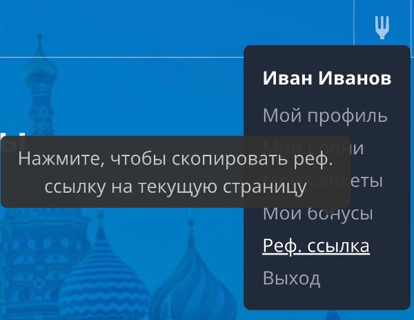 - На нужной странице откройте меню профиля (вилка в верхнем правом углу) и нажмите "Реф. ссылка" - ссылка будет скопирована в буфер обмена.