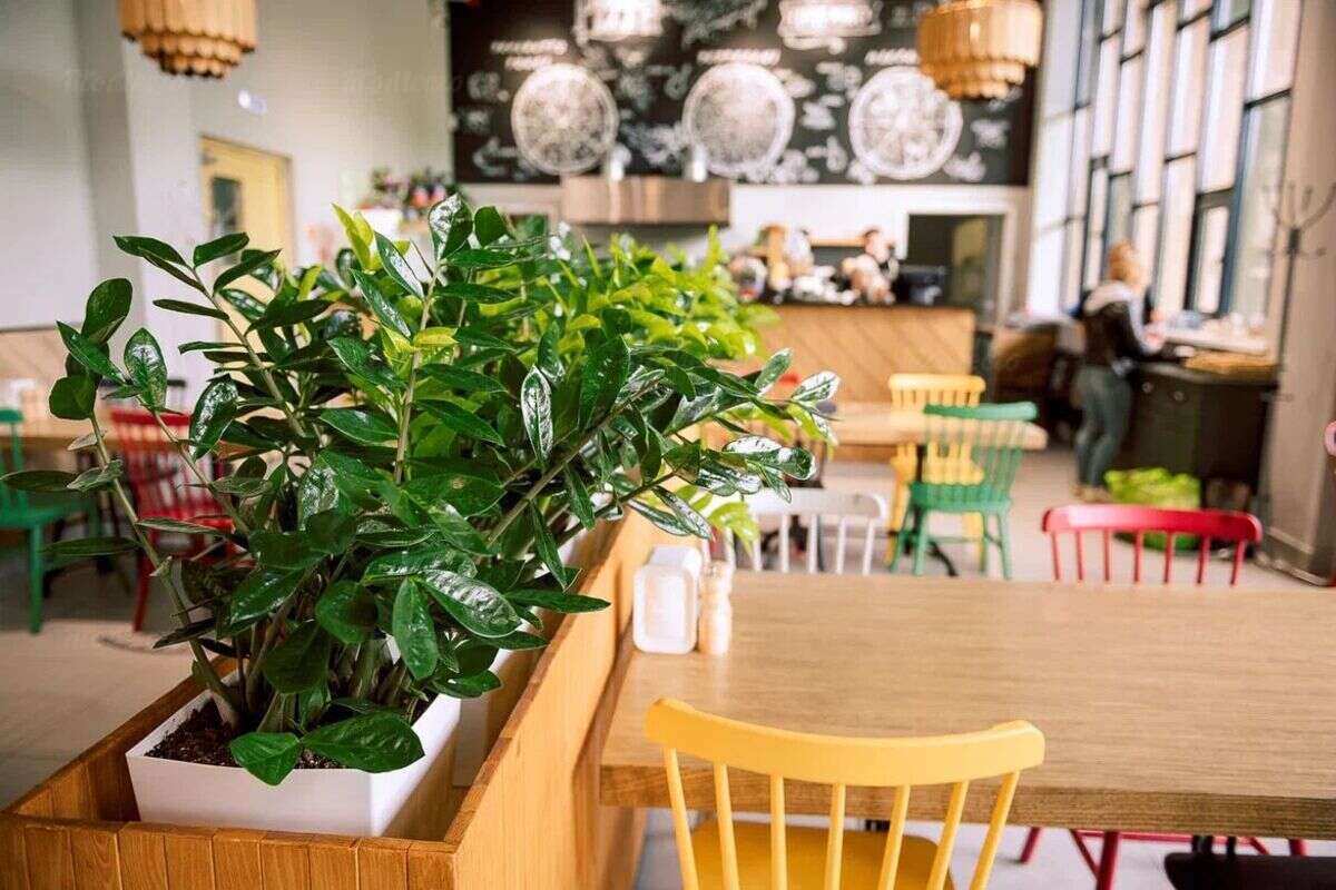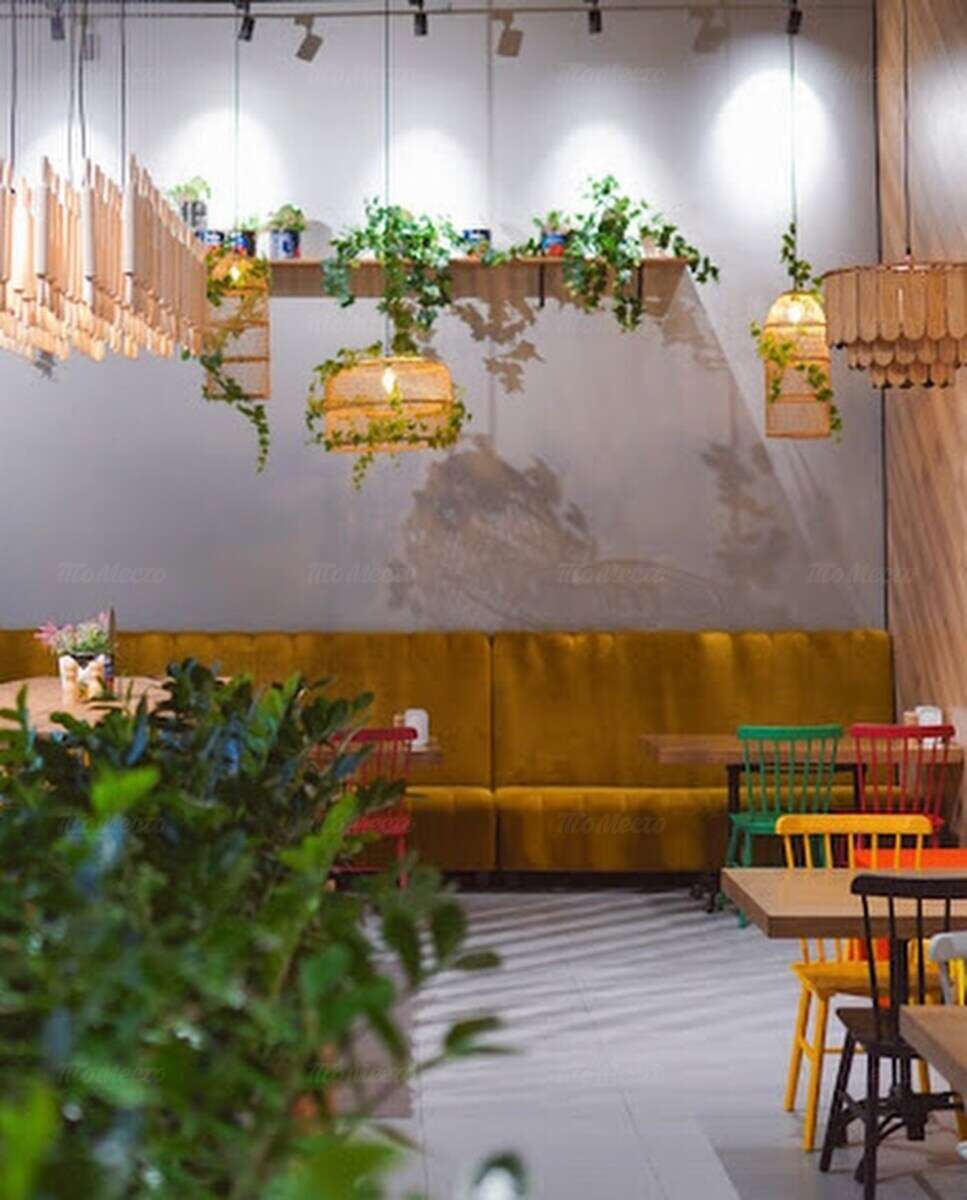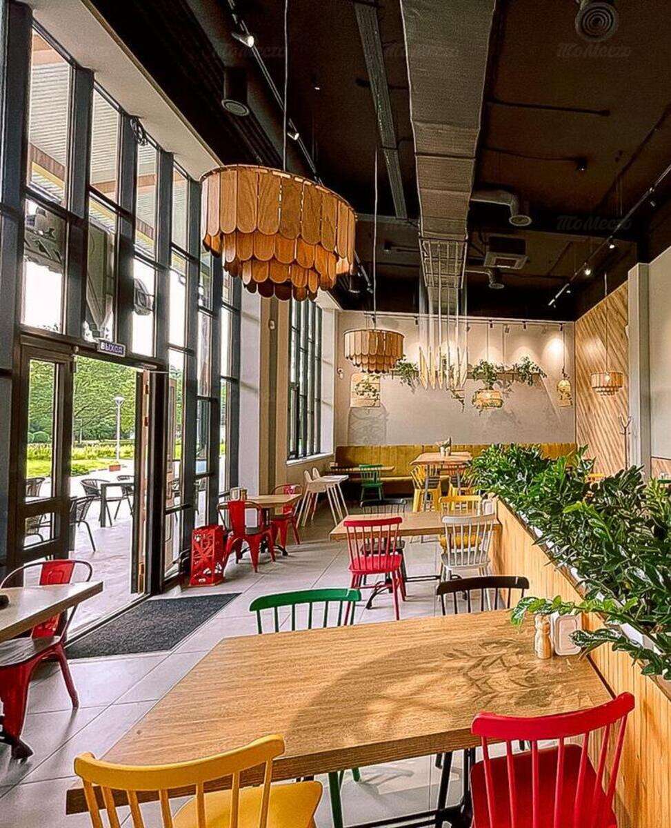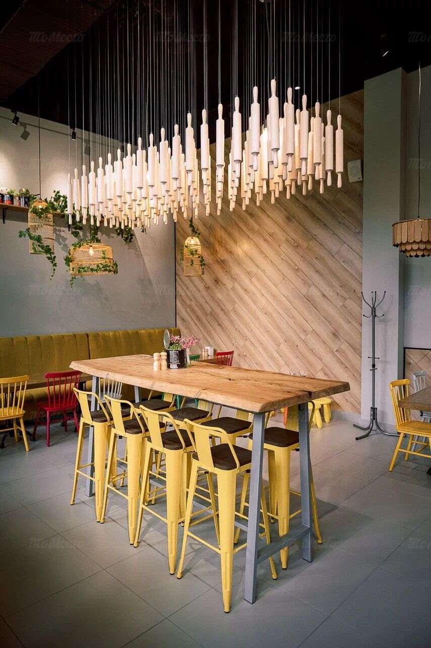 Минималистичный, но по-домашнему уютный интерьер наполнен сочной зеленью, яркими красками и интересными дизайнерскими решениями вроде композиции из нескольких десятков деревянных скалок, подвешенных над коммунальным столом в центре зала. В гармонии со свежими растительными мотивами — тепло натурального дерева, использованного для изготовления мебели, абажуров и настенных панелей. Панорамные окна с видом на пышные кроны деревьев Южного парка наполняют пространство естественным светом, поэтому здесь комфортно находиться в любое время дня.