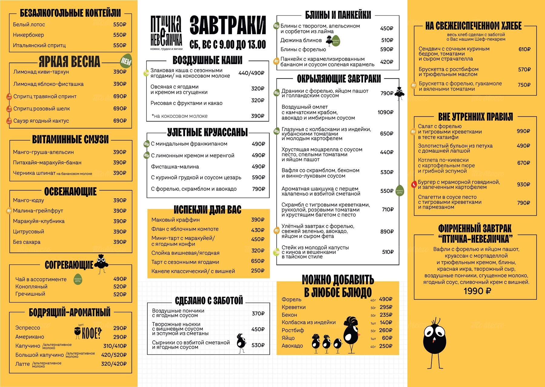 - Завтрак: Сб-вс с 9:00 до 13:00