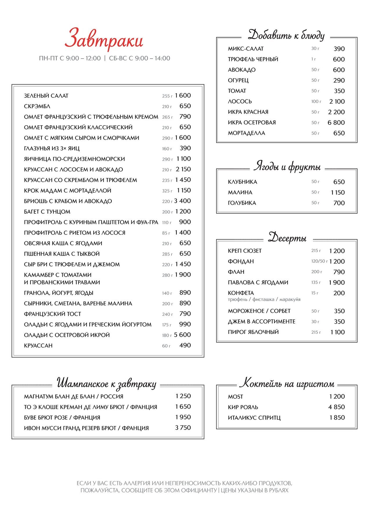 - Завтрак: Пн-пт 09:00-12:00, Сб-вс 09:00-14:00, От 1000 ₽