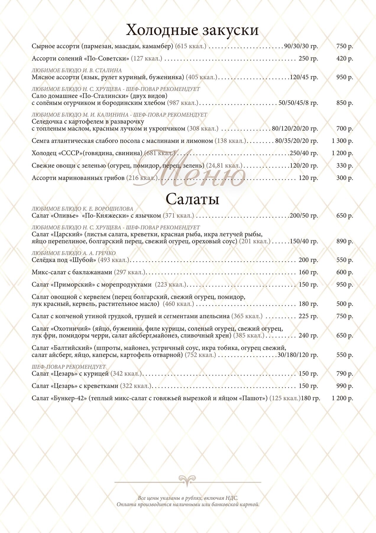 Меню и цены ресторана Бункер-42 в 5-ом Котельническом переулке фото 1