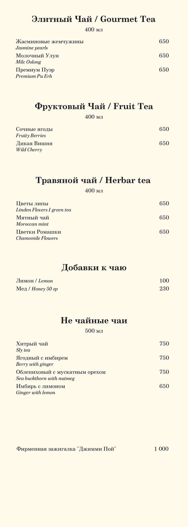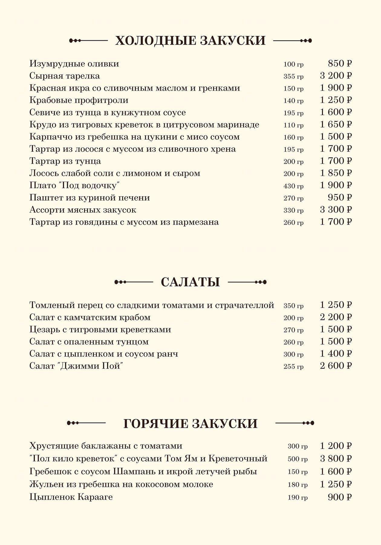 Меню караоке-клуба Джимми Пой в Лубянском проезде предложит гостям блюда европейской кухни, дополненные рецептами других стран. Для закуски подадут тартар из говядины с муссом из пармезана, карпаччо из гребешка на цукини с мисо соусом, севиче из тунца в кунжутном соусе. На обед подают тайский том ям. Среди горячих блюд — филе подкопчённого муксуна с драниками, томлёная голень ягнёнка со стейком из баклажана. Поклонникам пасты предложат чёрную пасту с крабом, для тех, кто любит Японию — роллы и гёдза.