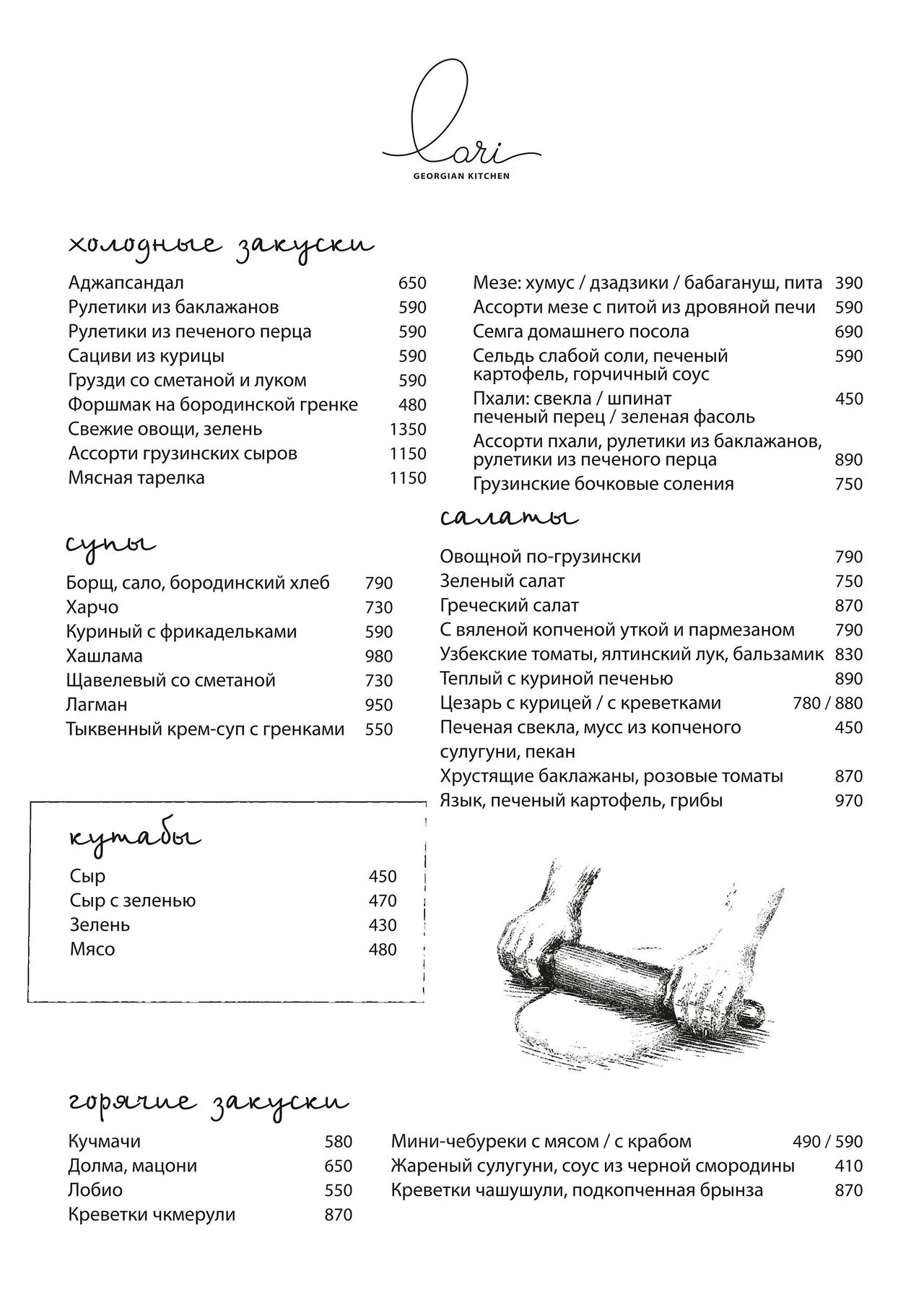 Lari — это гармония Грузии и Европы. В меню: сочные хинкали, мясо на углях и ароматная выпечка из печи. Рекомендуют пхали, сациви, оджахури со свининой и телятину чашушули на кеци. Из европейских позиций стоит попробовать форшмак на бородинской гренке, оливье, утиную ножку с картофельным пюре и демигласс, казаречче с вешенками и пудрой из белых грибов. В финале — тёплый яблочный пирог с пломбиром и трюфели ручной работы.