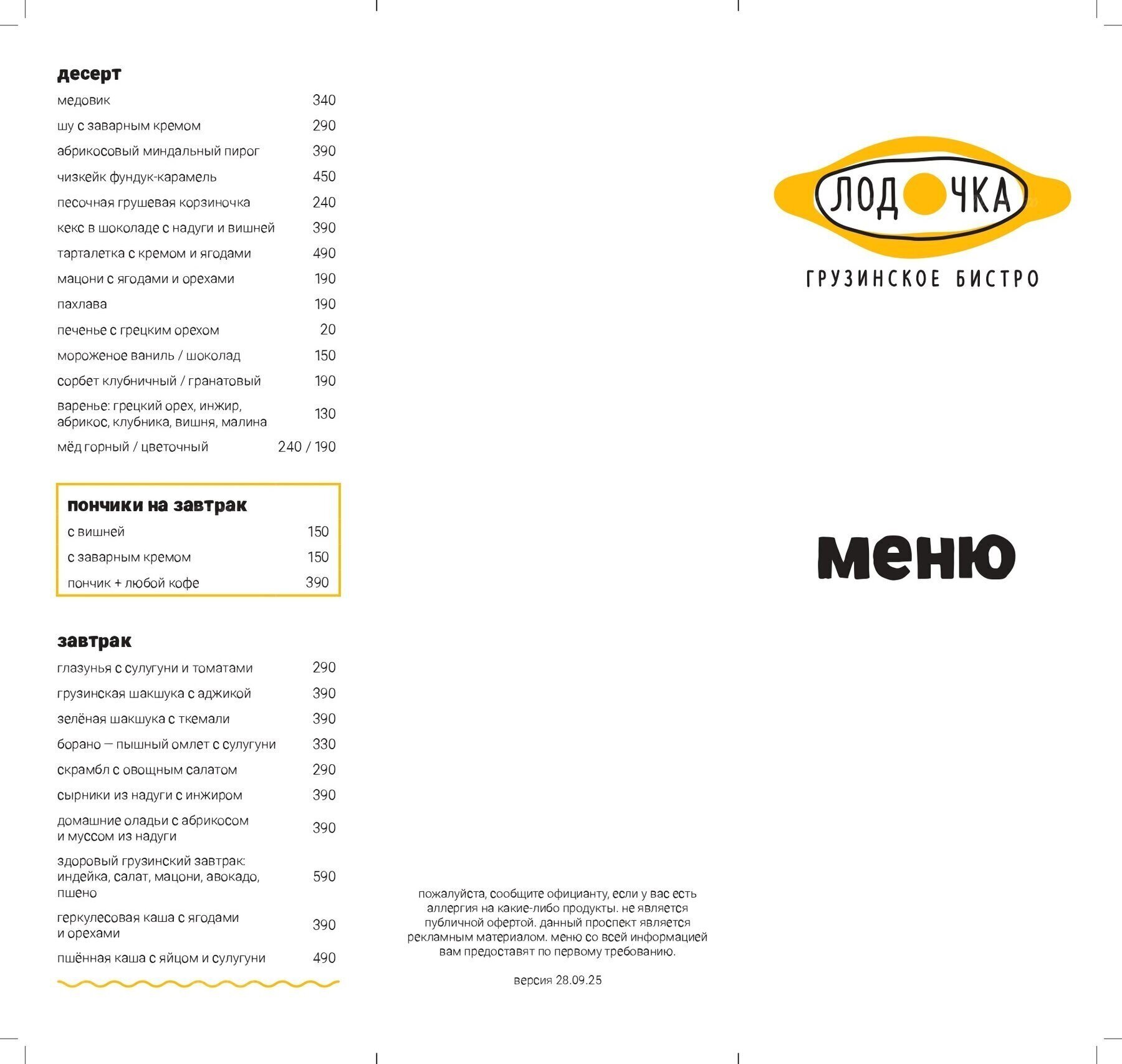 Меню и цены
