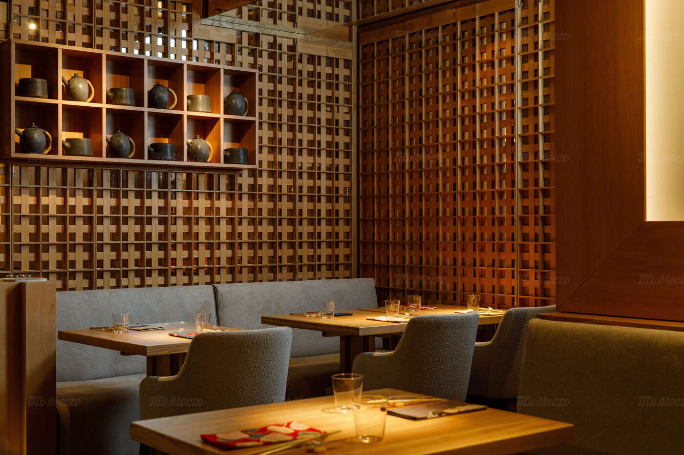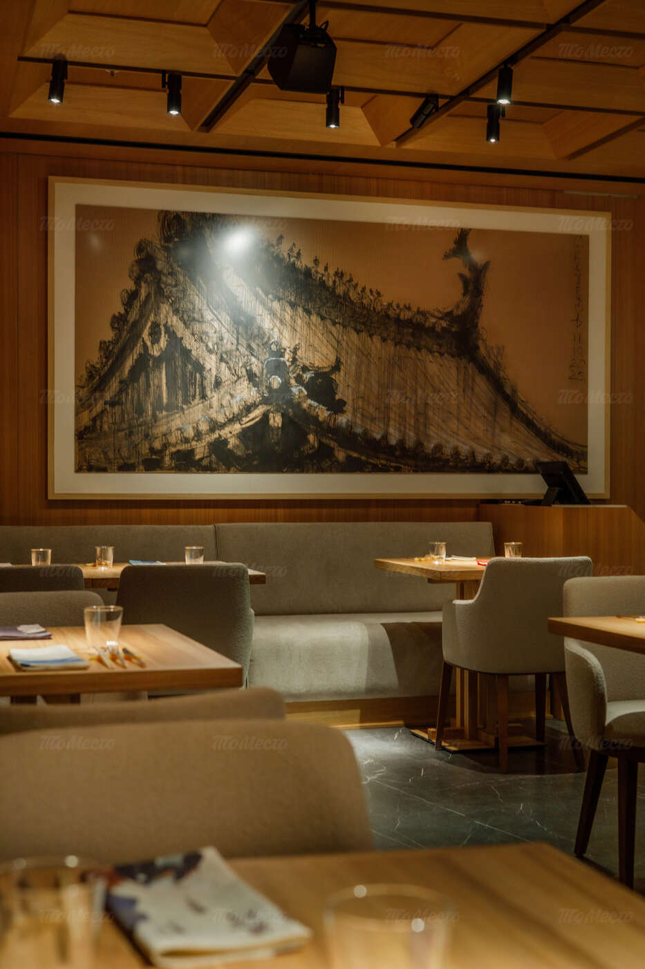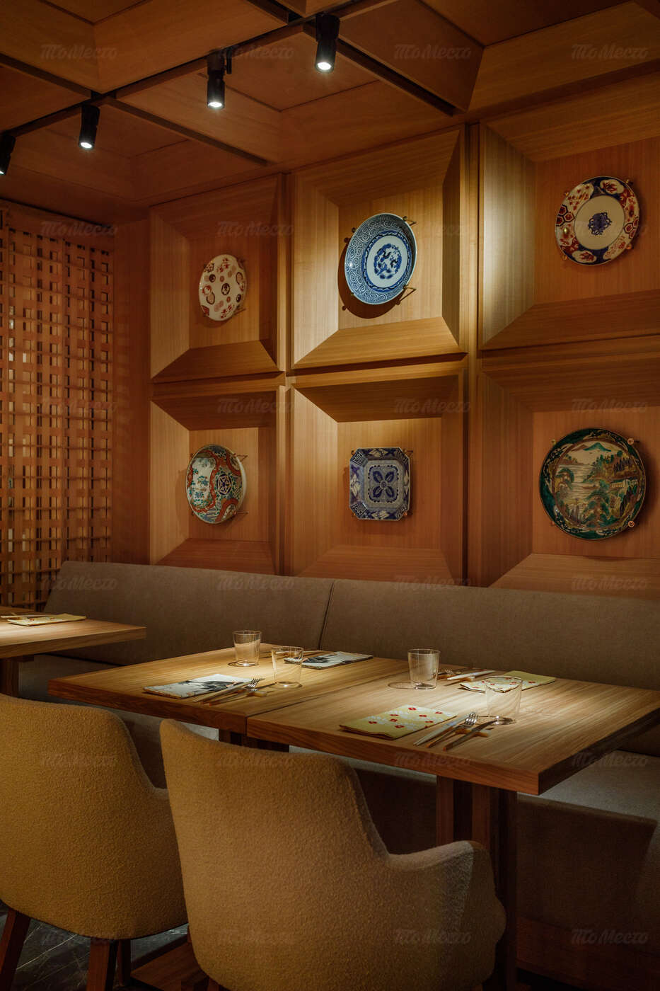 Ресторан открыл свои двери в известной локации — в «Метрополе» —- и вместил два этажа, где выделены: зона главного зала и открытая кухня, пространство с баром и частным залом, рассчитанным на камерные ужины в узком кругу. Ресторан удивит гостей на минус первом этаже: здесь ждёт иммерсивная панорама Токио под ночным небом. В интерьере — вдохновение от японского минимализма, стремление наслаждаться природой и видеть детали. Светлые оттенки дерева, камня и металла работают в унисон с белым стеклом, а в дополнение к арт-декору дизайнеры делают ставку на разницу фактур. Довершает атмосферу японский джаз, звучащий в Токио сегодня.