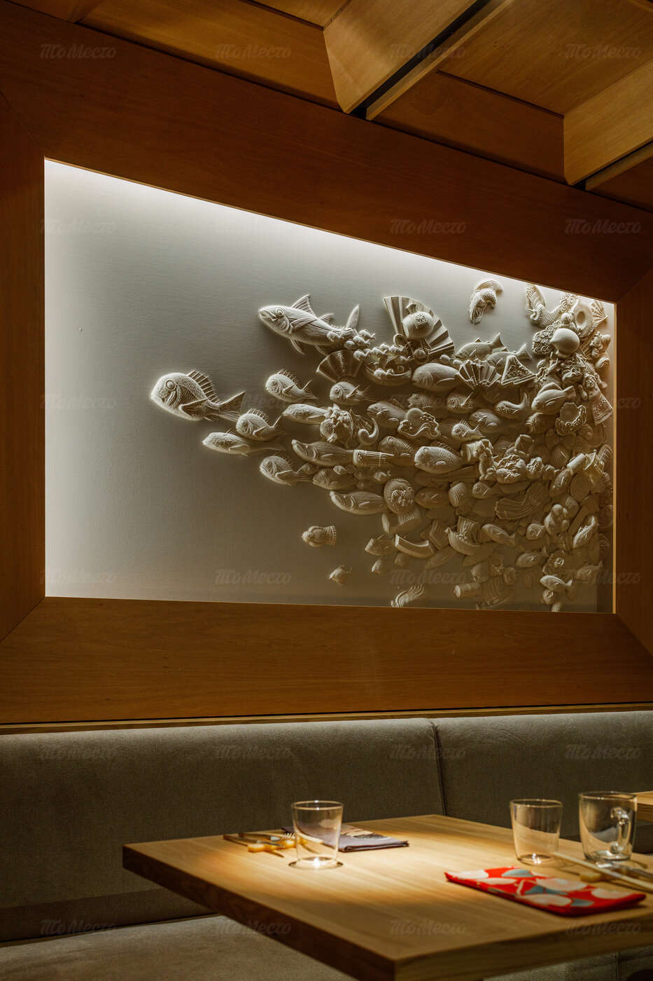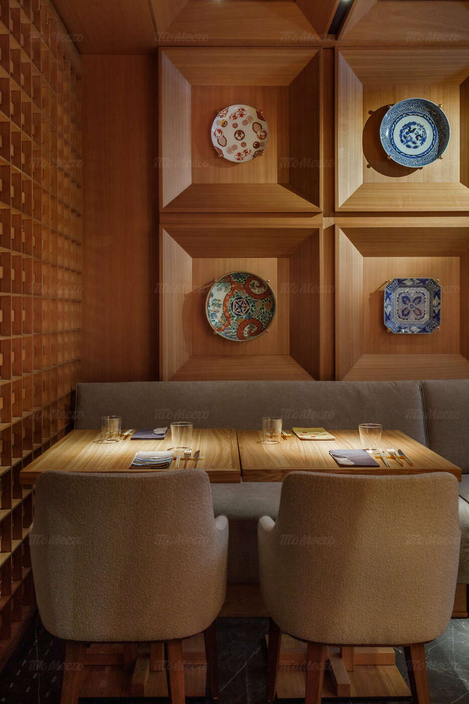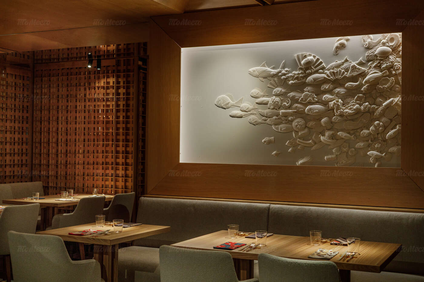 Ресторан открыл свои двери в известной локации — в «Метрополе» —- и вместил два этажа, где выделены: зона главного зала и открытая кухня, пространство с баром и частным залом, рассчитанным на камерные ужины в узком кругу. Ресторан удивит гостей на минус первом этаже: здесь ждёт иммерсивная панорама Токио под ночным небом. В интерьере — вдохновение от японского минимализма, стремление наслаждаться природой и видеть детали. Светлые оттенки дерева, камня и металла работают в унисон с белым стеклом, а в дополнение к арт-декору дизайнеры делают ставку на разницу фактур. Довершает атмосферу японский джаз, звучащий в Токио сегодня.