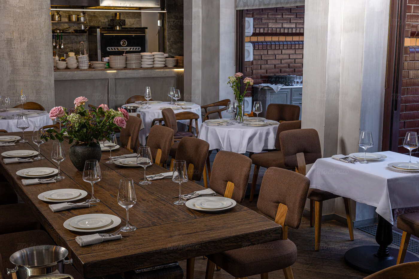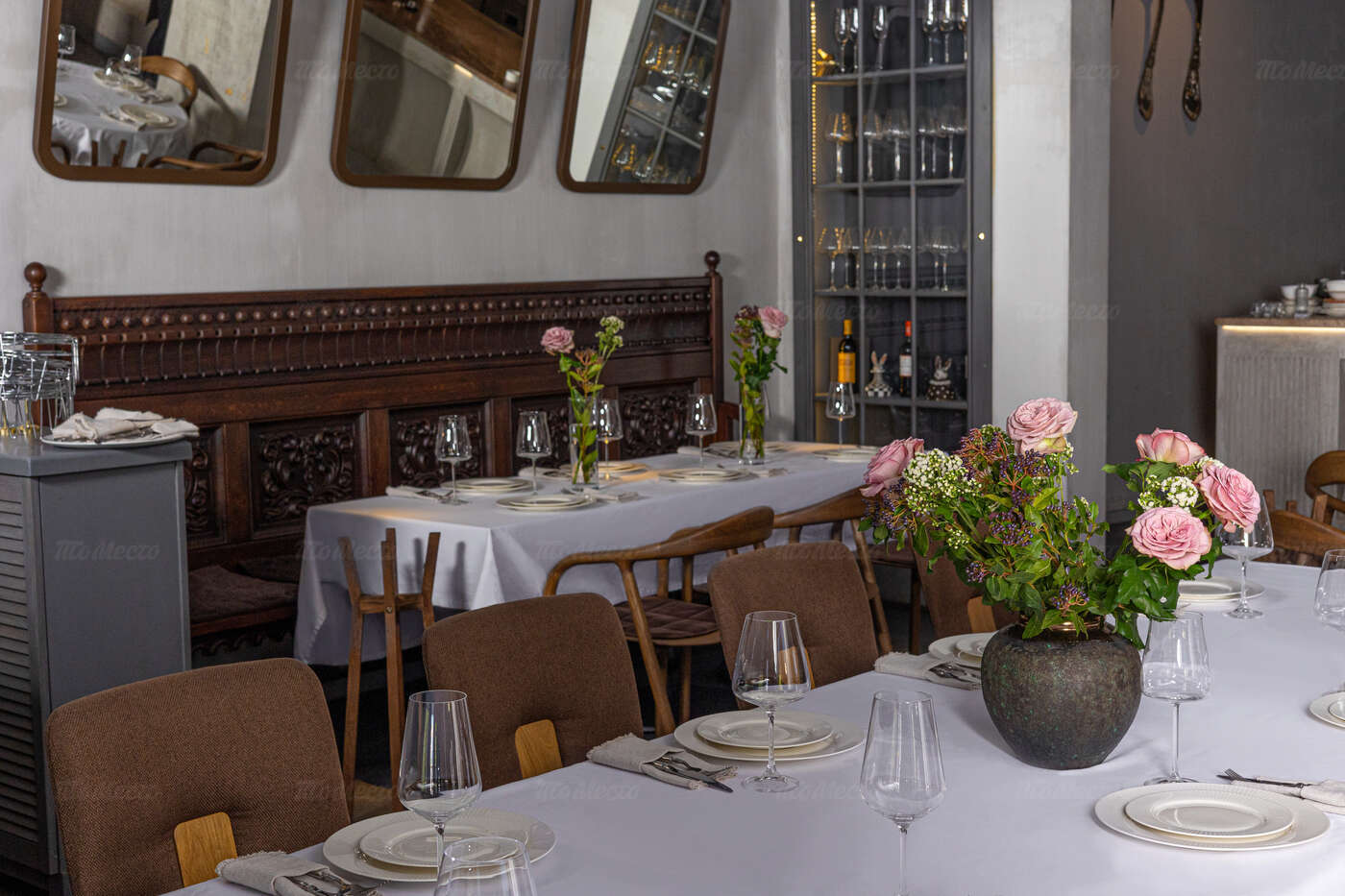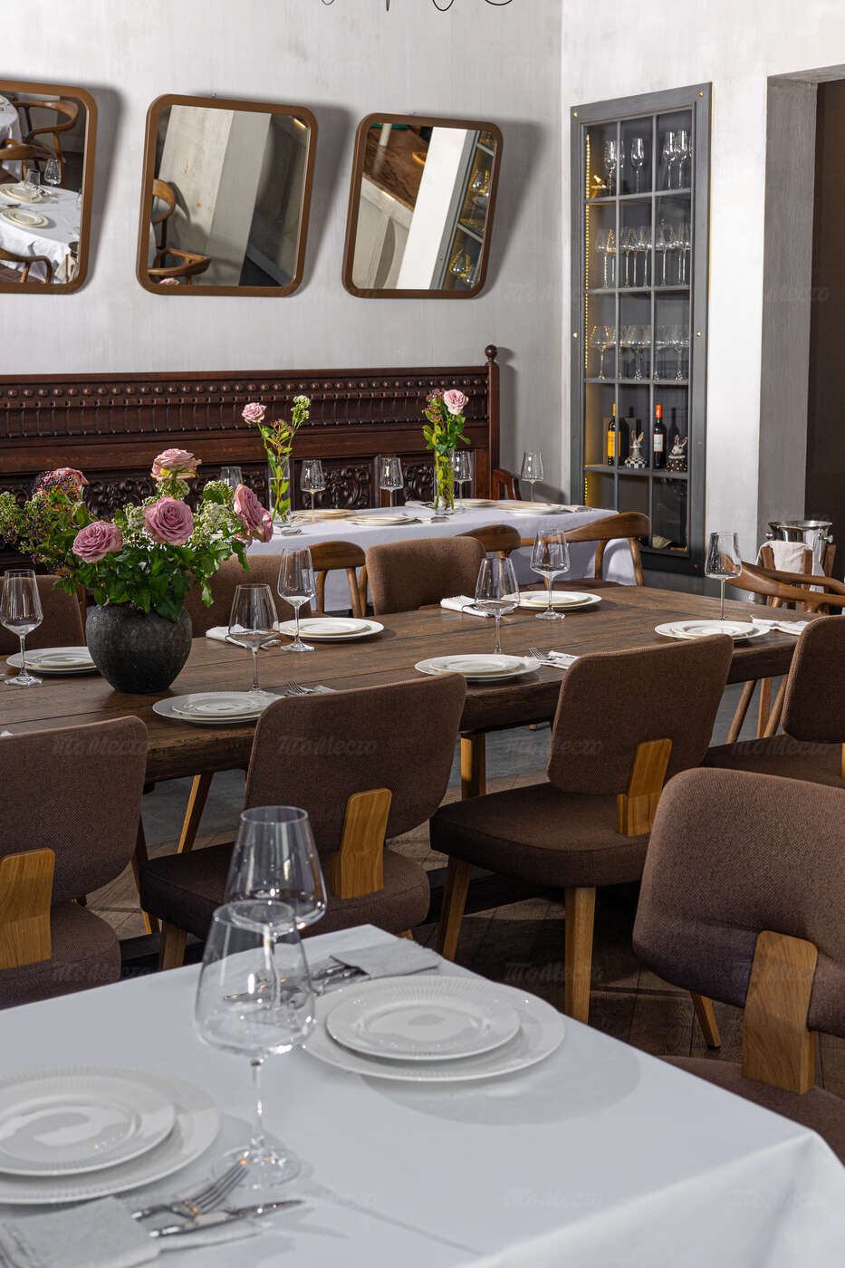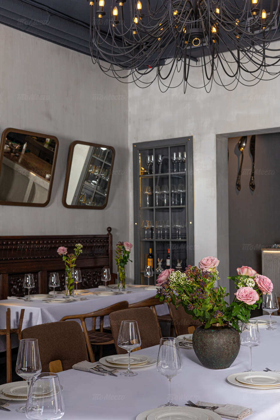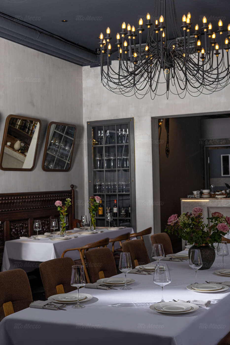 Ресторан находится в оживлённом районе столицы, где историческая атмосфера сливается воедино с современными образами, и занимает панорамное здание, окна которого выходят прямо на Грузинскую площадь. В интерьере — эстетичное сочетание металлических, жемчужных и графитовых оттенков, минималистичные формы, зеркала в рамах и живая флористика, тщательно подобранная под настроение. Главным визуальным акцентом стала тихая роскошь, воплощённая в резном декоре, люстрах-канделябрах и других деталях.