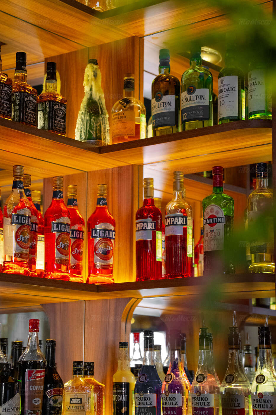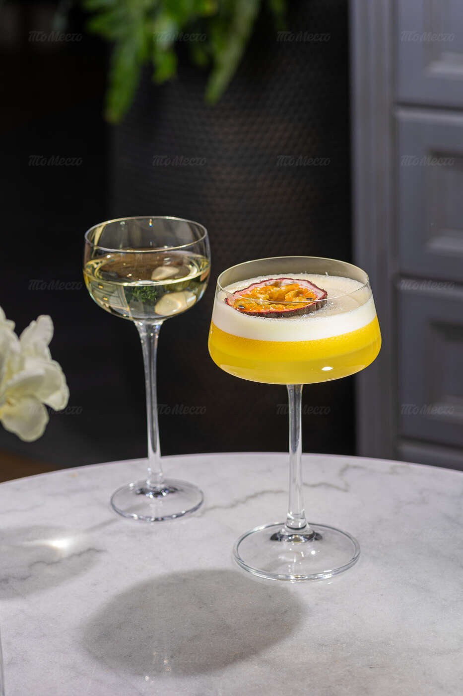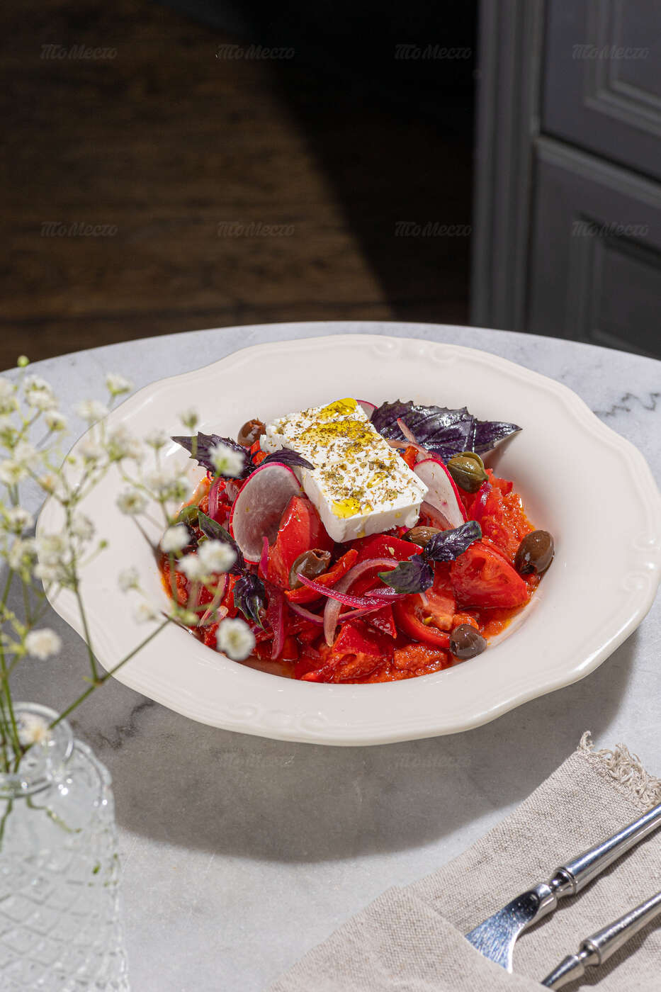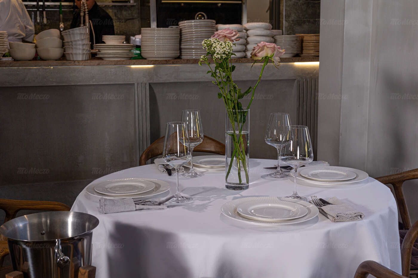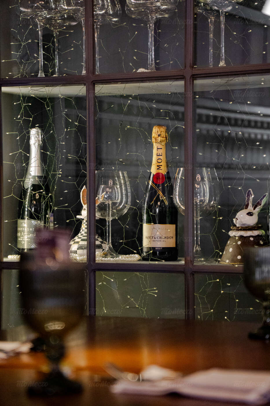Ресторан находится в оживлённом районе столицы, где историческая атмосфера сливается воедино с современными образами, и занимает панорамное здание, окна которого выходят прямо на Грузинскую площадь. В интерьере — эстетичное сочетание металлических, жемчужных и графитовых оттенков, минималистичные формы, зеркала в рамах и живая флористика, тщательно подобранная под настроение. Главным визуальным акцентом стала тихая роскошь, воплощённая в резном декоре, люстрах-канделябрах и других деталях.