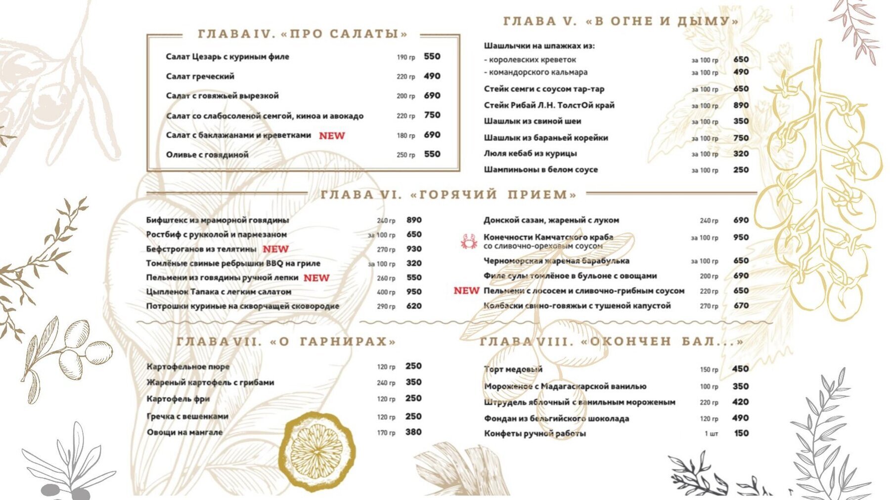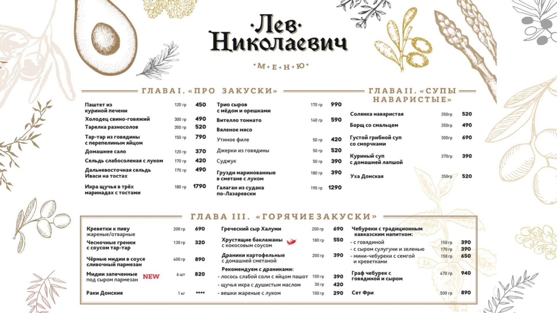 Меню в ресторане Лев Николаевич на улице Тренёва включает блюда русской, донской и европейской кухни в авторском и традиционном варианте. Оцените мини-чебурек с сёмгой и креветками, дальневосточную сельдь на тостах, маринованные грузди — для закуски. Среди вариантов горячего собрали конечности камчатского краба, потрошки куриные на сковороде, жаренный с луком донской сазан. В разделе «Окончен бал» представлены десерты: штрудель, фондан из бельгийского шоколада.
