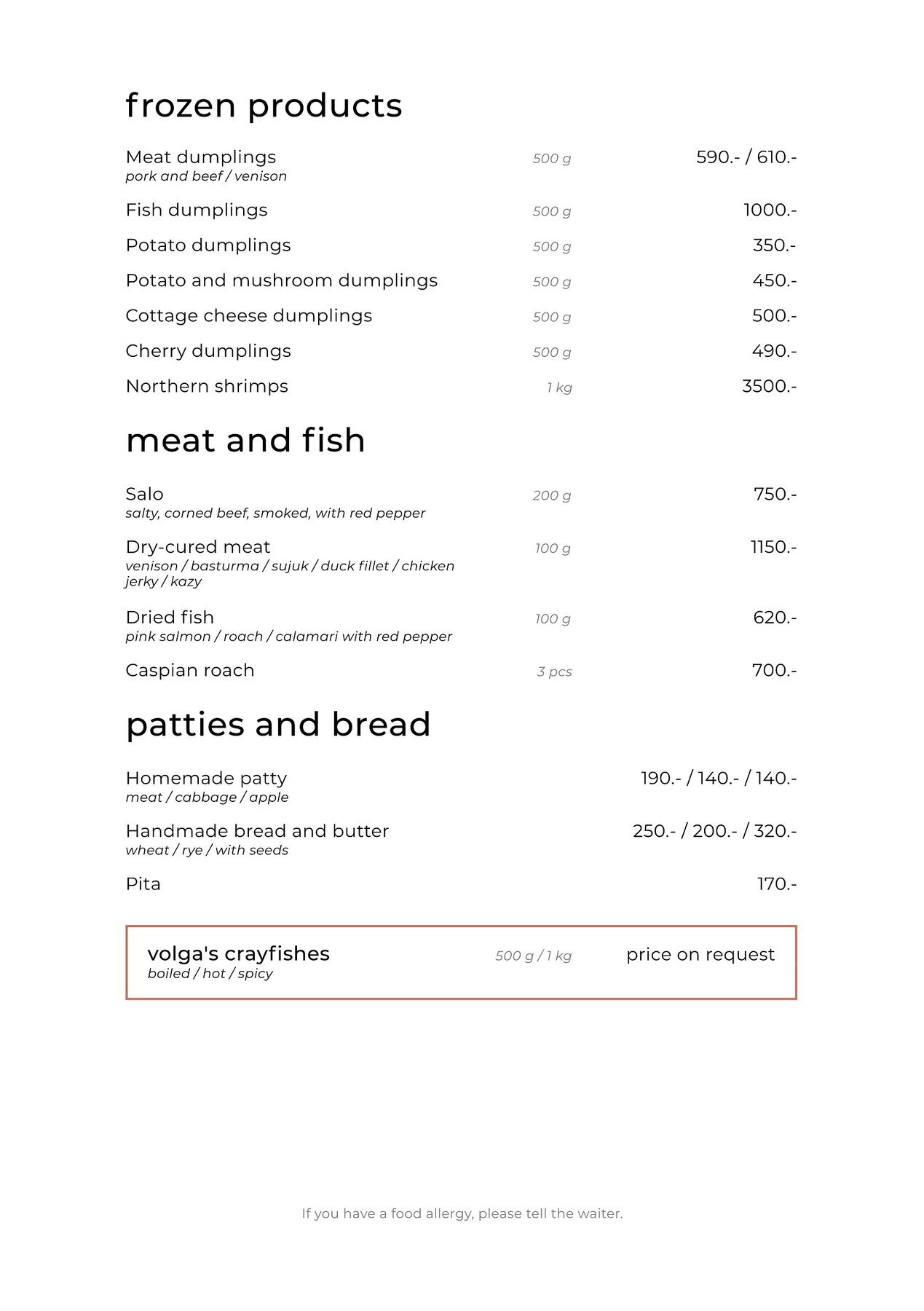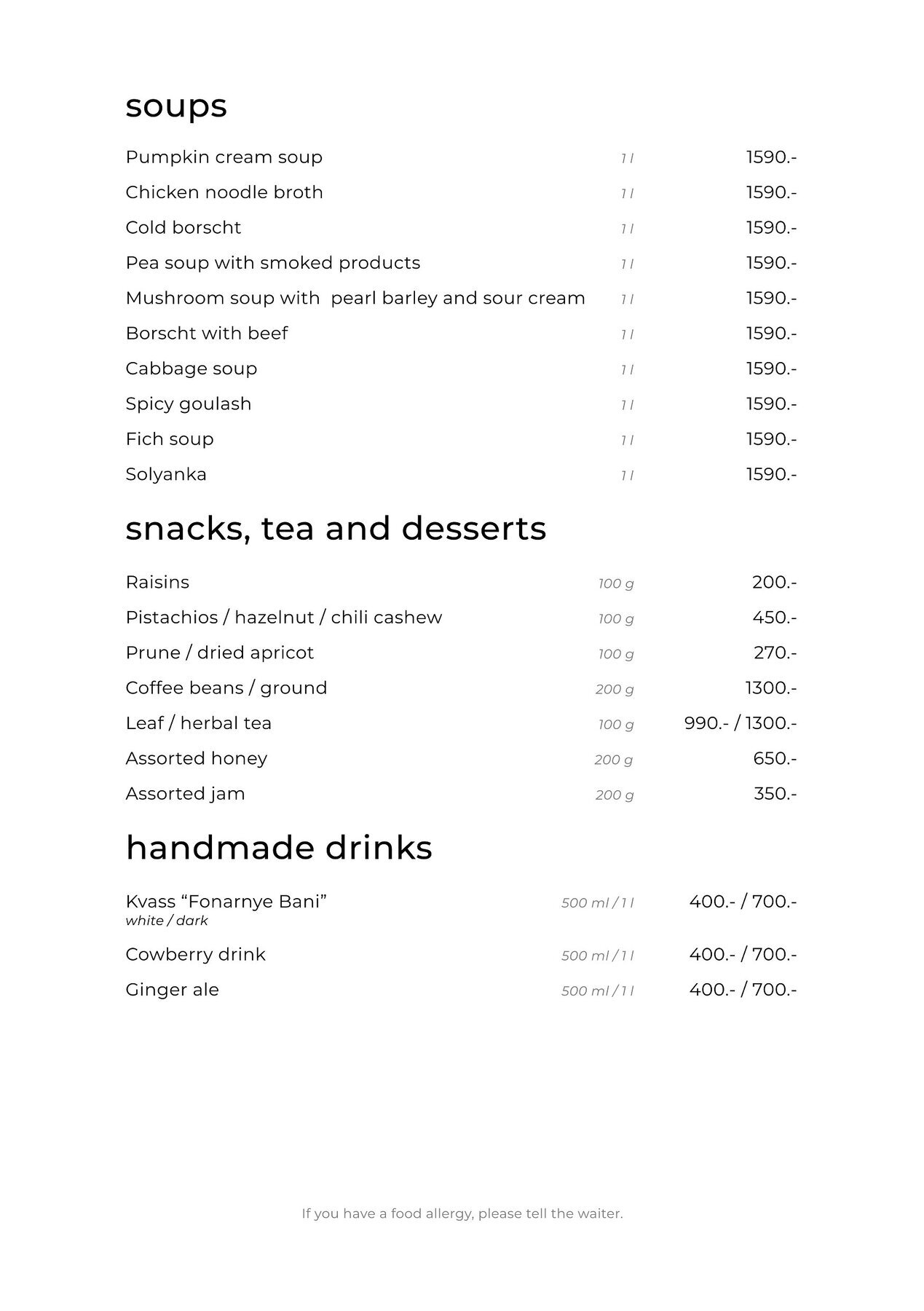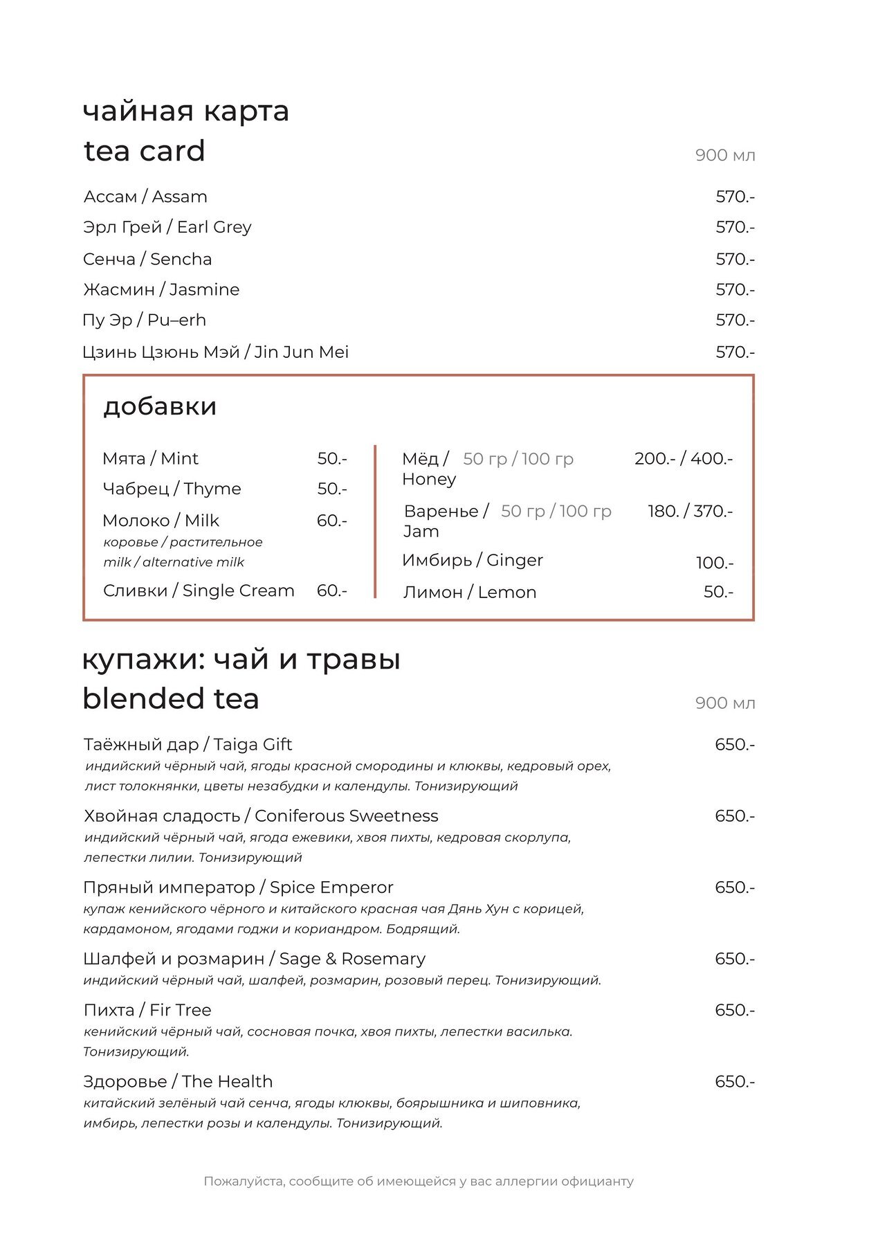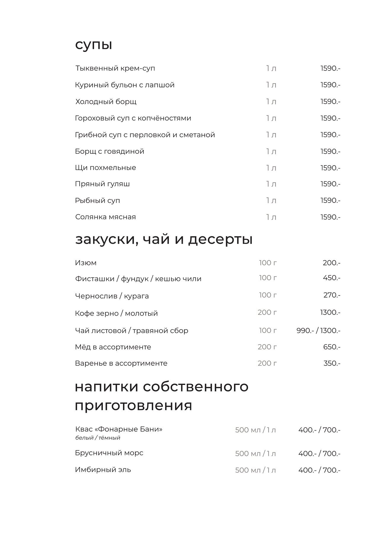 Ежедневно с 11 часов и в течение всего дня готовят домашние завтраки. Каждое утро выпекают багеты, булочки, хлеб и караваи — свежую выпечку можно взять с собой. С 12 до 16 часов по будням действует меню деловых обедов. Для юных гостей составили отдельное меню с полезными блюдами. По четвергам устраивают чаепитие с чаем из настоящего самовара с мёдом, вареньем и сухофруктами.