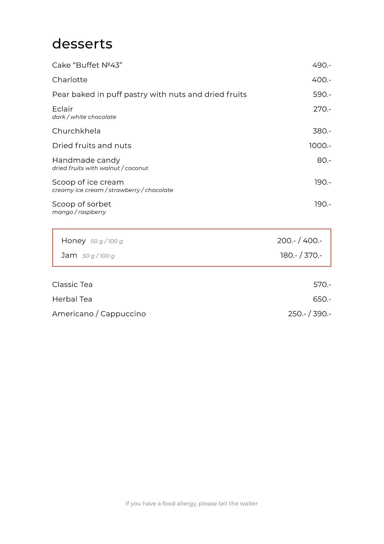 В меню Буфет №43 — блюда русской и европейской кухни в классическом исполнении. На закуску — салат с куриной печенью, нисуаз, холодец с хреном и драники со сметаной. На первое готовят борщ с пампушками и сметаной, пряный гуляш, похмельные щи с пирожком. На горячее гостей ждут пельмени и вареники, котлеты из трески с пюре из тыквы, куриный шницель с салатом и крылья, запечённые с соусом. К блюдам подают настойки собственного производства.