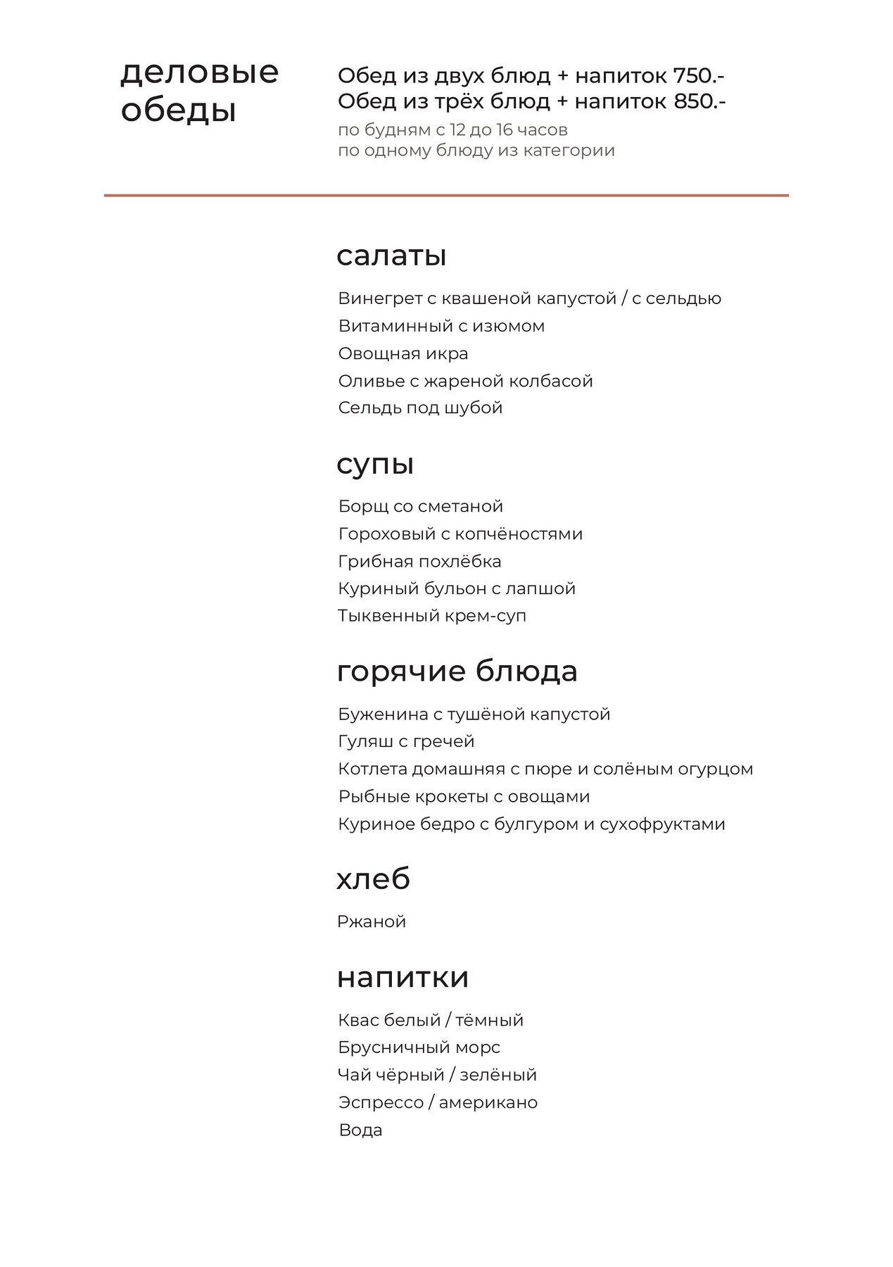 - Бизнес-ланч: Пн–пт 12:00–16:00, 750 ₽