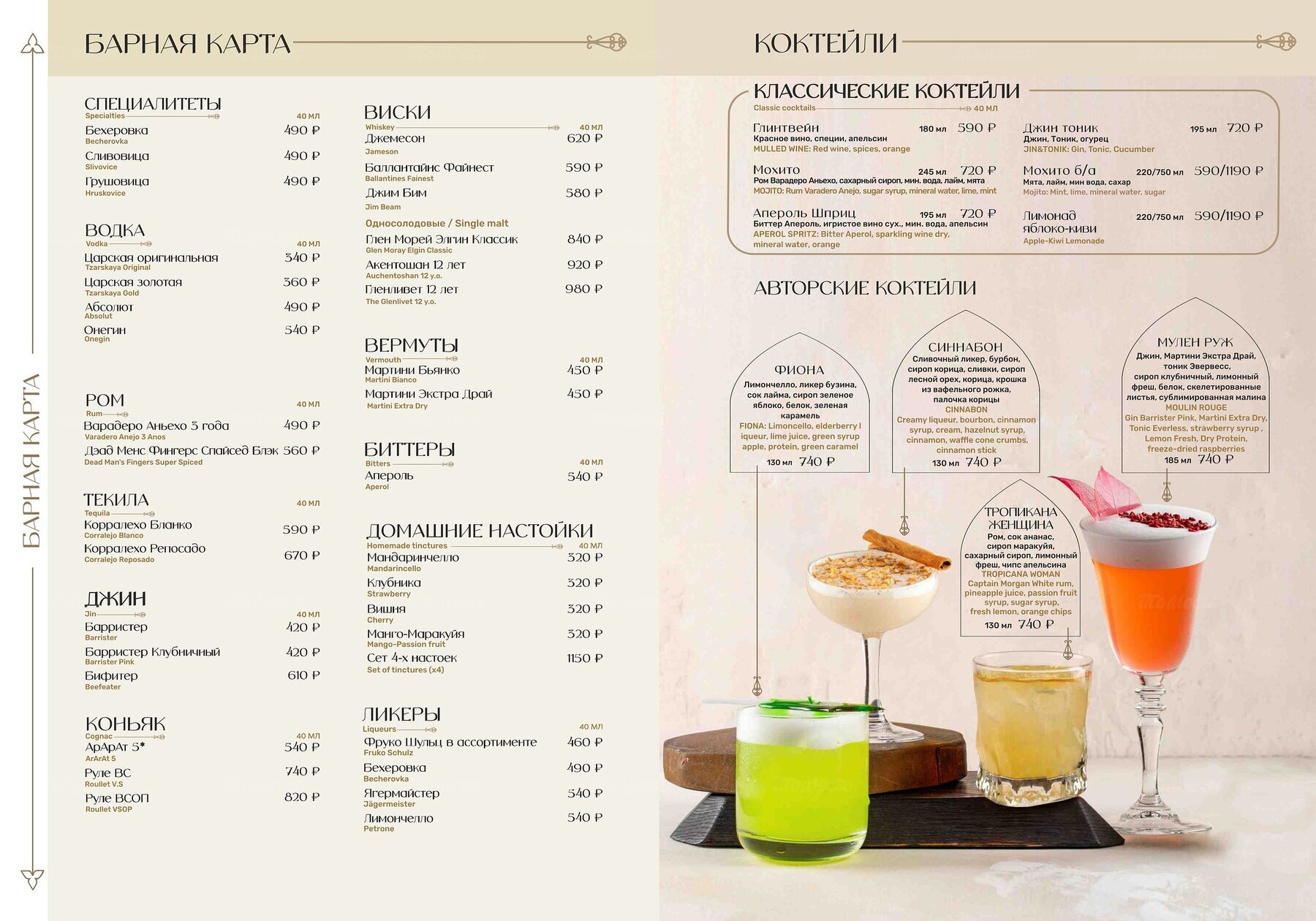 Бежево-коричневый интерьер в природных оттенках и длинные, довольно узкие залы со сводчатыми потолками и многочисленными нишами обеспечивают комфортный и достаточно уединённый отдых. Высокие массивные стеллажи из тёмного дерева, небольшая стойка, узкие залы, разделённые на зоны с помощью подиумов, разномастные люстры — пространство ресторана дробится на множество локаций, каждая из которых по-своему хороша. Цветные кресла и диваны с мягкими подушками добавляют в интерьер ярких красок, а тематические рисунки на стенах поддерживают уютную атмосферу.