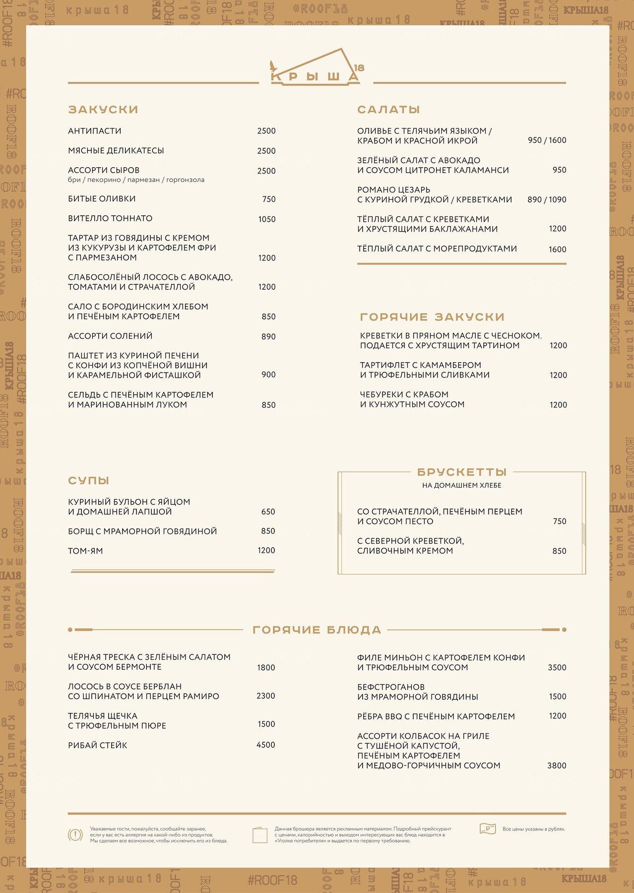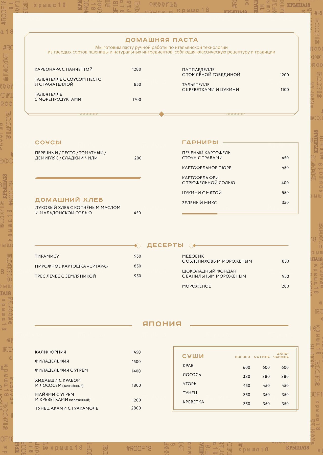Крыша 18 — универсальный ресторан на Петроградской набережной, одинаково подходящий для деловых ланчей, романтических ужинов, празднования дней рождений и приятных вечеров среди друзей, наслаждающихся неповторимым городским пейзажем.