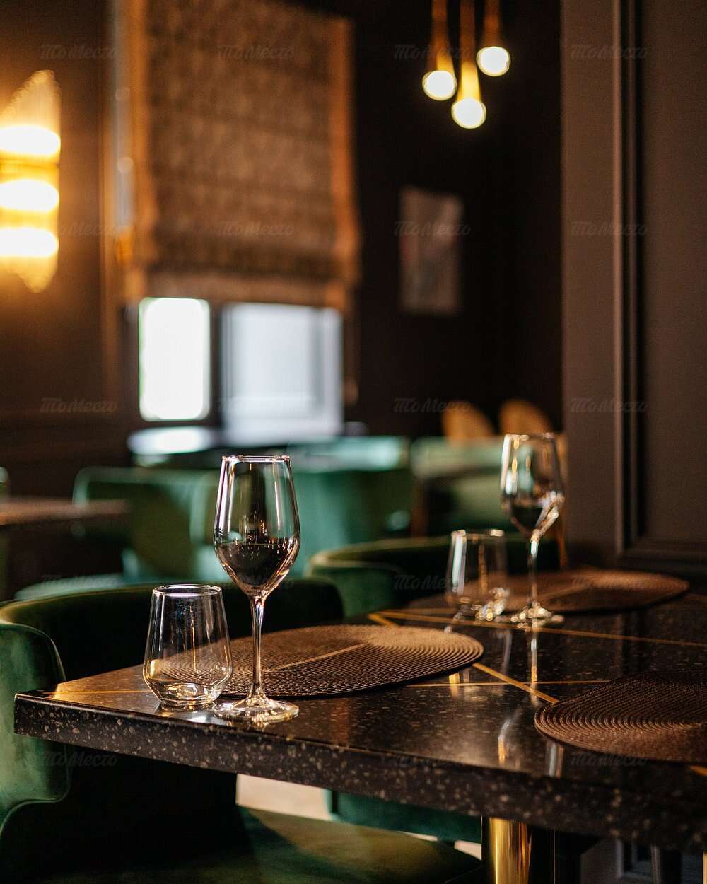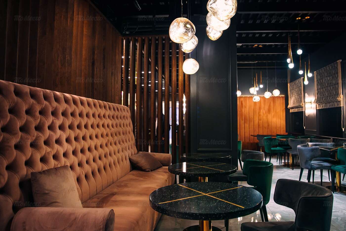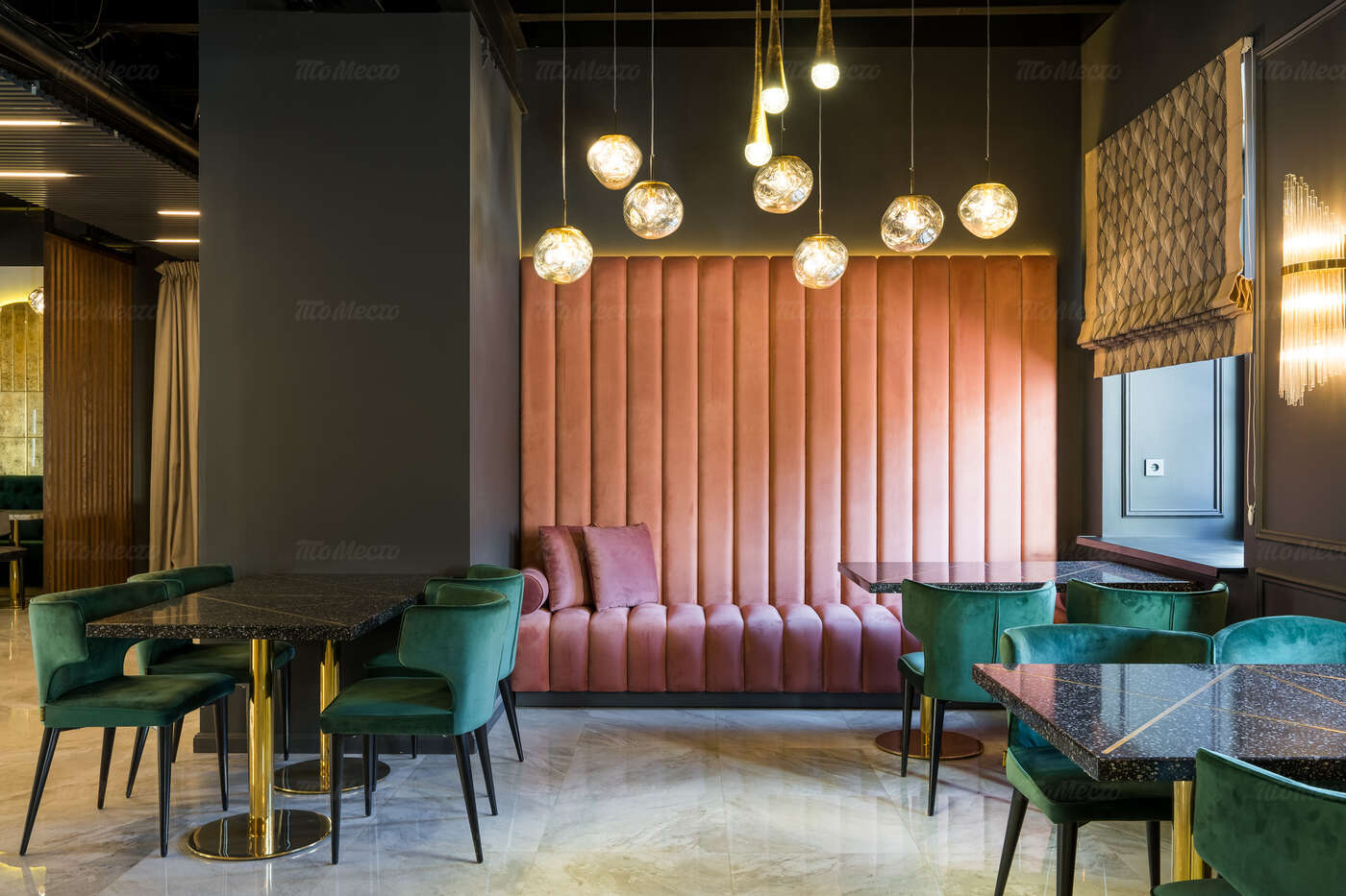 Благородное сочетание лиловых и изумрудных оттенков, натуральное дерево и переливающаяся бликами в свете глянцевых светильников латунь, современная мебель интересных форм, сочная зелень растений. Продуманный до мелочей интерьер создаёт уютную и одновременно элегантную атмосферу, комфортную и для отдыха с друзьями, и для деловых встреч. Большие окна дают возможность любоваться огнями вечернего города, а днём — наполняют пространство естественным светом, игриво отражающимся на мраморных рисунках столешниц.