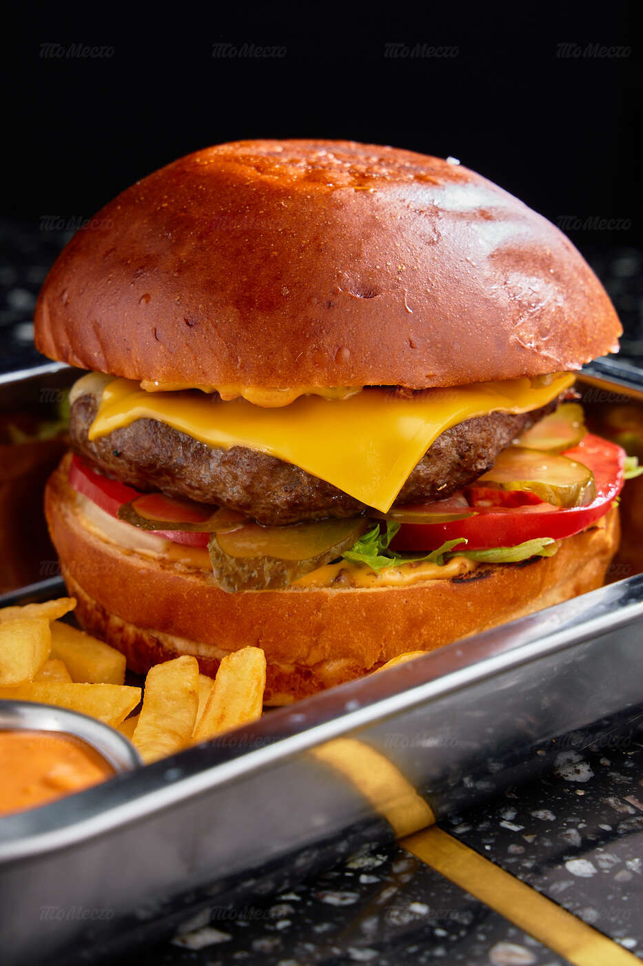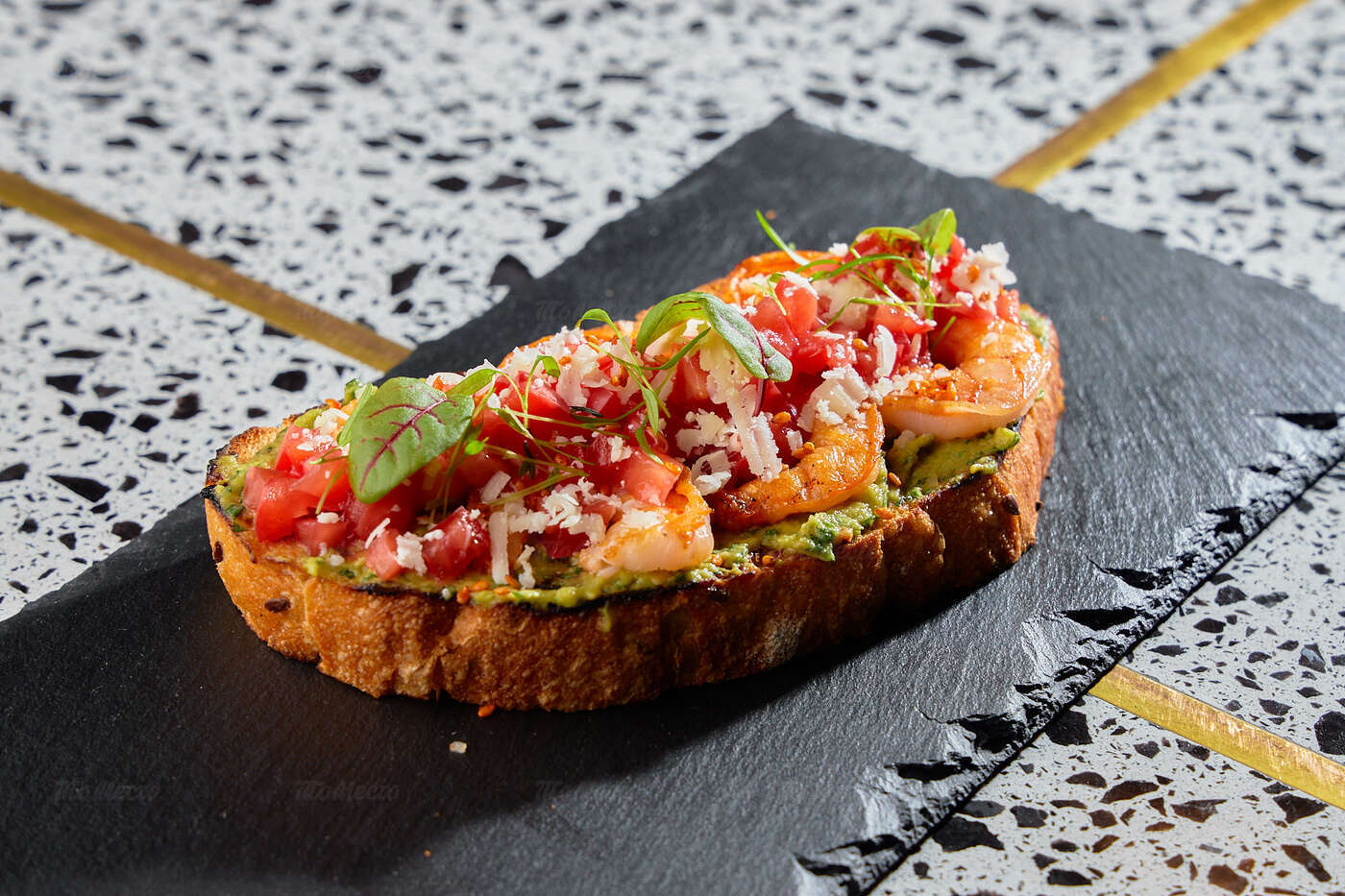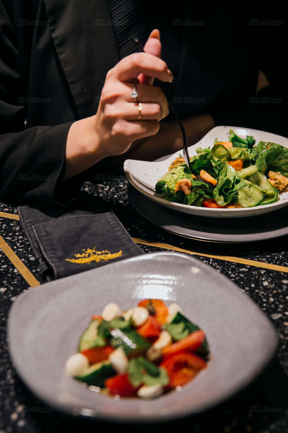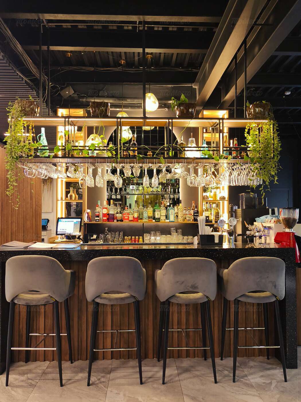 Благородное сочетание лиловых и изумрудных оттенков, натуральное дерево и переливающаяся бликами в свете глянцевых светильников латунь, современная мебель интересных форм, сочная зелень растений. Продуманный до мелочей интерьер создаёт уютную и одновременно элегантную атмосферу, комфортную и для отдыха с друзьями, и для деловых встреч. Большие окна дают возможность любоваться огнями вечернего города, а днём — наполняют пространство естественным светом, игриво отражающимся на мраморных рисунках столешниц.